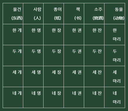 固有数词1-4(하나, 둘 셋, 넷)在量词前变成한, 두, 세, 네。