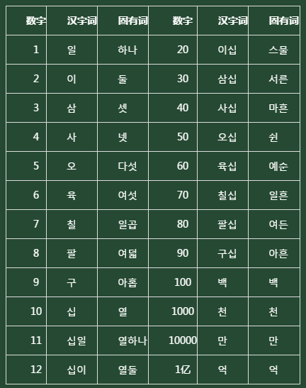 韩国语中有两种计数方法。数数时主要用固有数词,读号码等时用汉字数词。